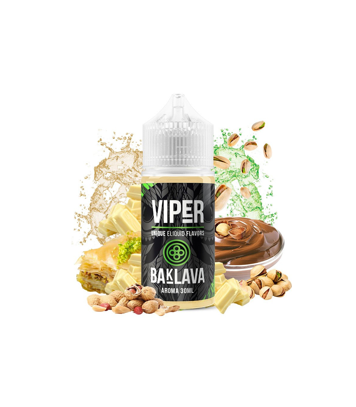 El aroma Baklava de Viper sabe a una equilibrada combinación de milhojas relleno de crema de avellanas, virutas de pistacho y cacahuete, rociado con chocolate blanco.