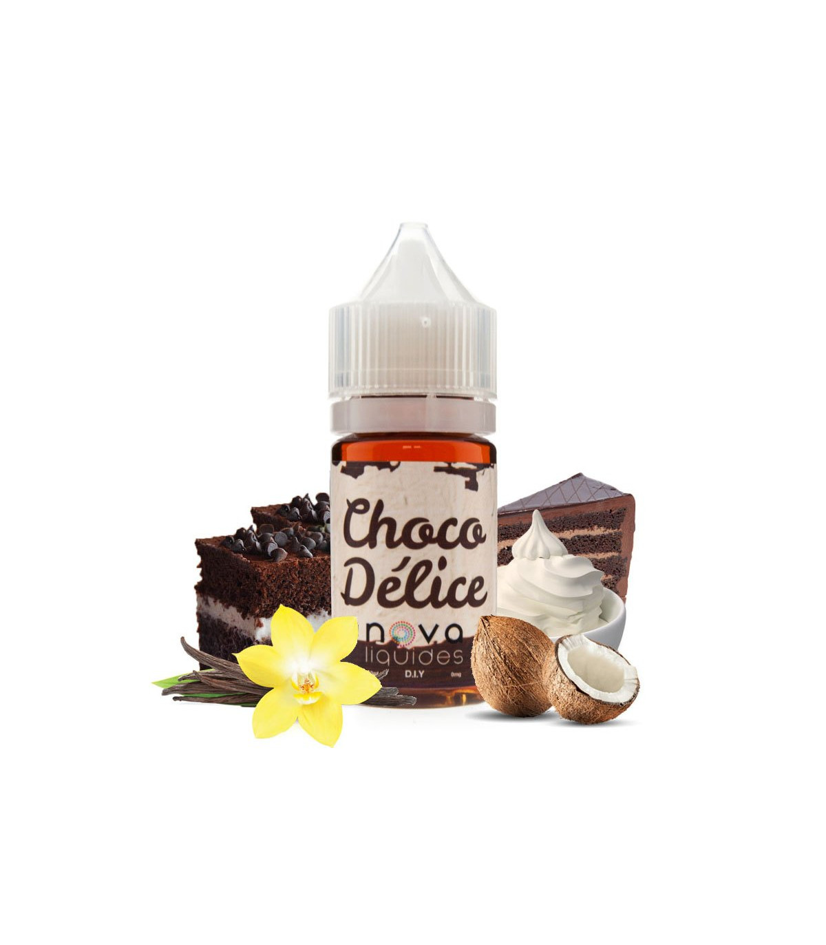 El aroma Choco Délice de Nova Liquides sabe a exquisita torta de bizcocho de chocolate con vainilla, relleno de crema y coco.