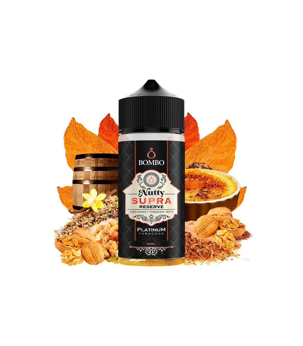 El aroma Nutty Supra Reserve en formato Longfill de Platinum Tobaccos by Bombo es una variación de Supra (Mejor Tabaquil en Vapexpo 2022), famoso por su exquisito sabor a tabaco dulce con matices acaramelados y tostados, ahora combinado con deliciosa crema de frutos secos.