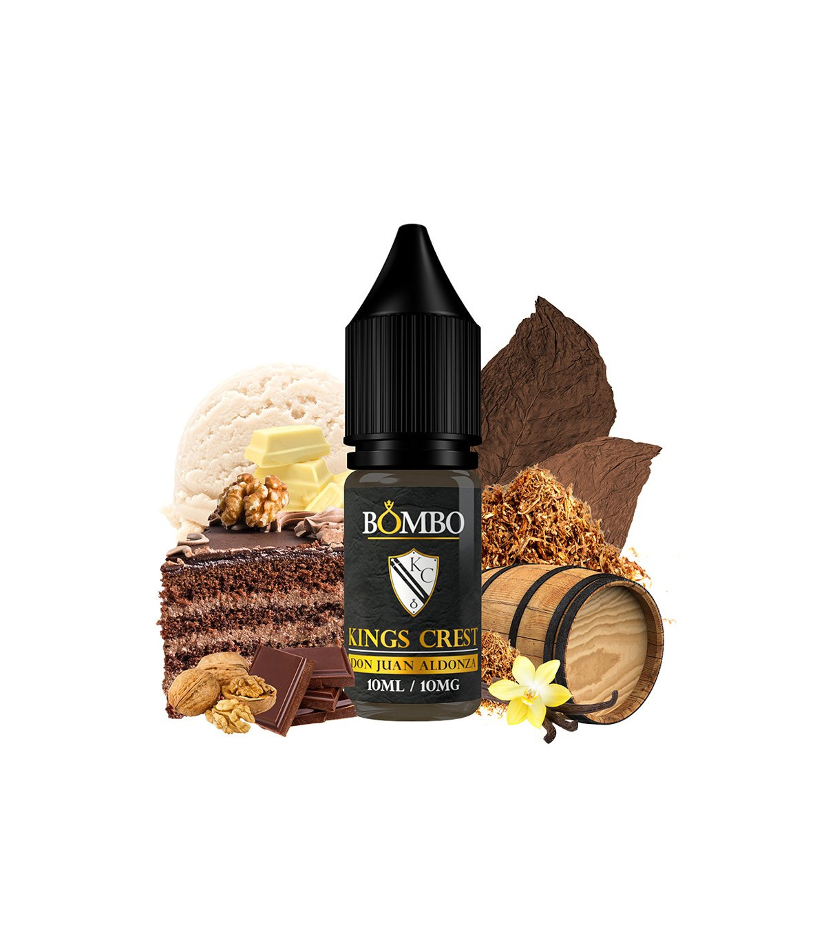 El líquido Don Juan Aldonza de Kings Crest Salts & Bombo fusiona Don Juan Reserve y Aldonza Reserva: una tarta de chocolate con galletas graham, mantequilla de nueces pecanas y crema batida que, junto a unas finas notas de tabaco con vainilla envejecido en barrica de roble americano, forman una receta para enmarcar.