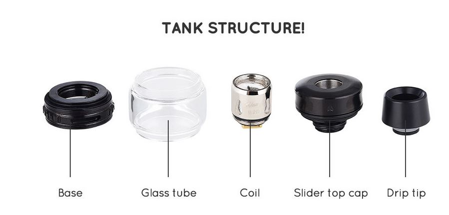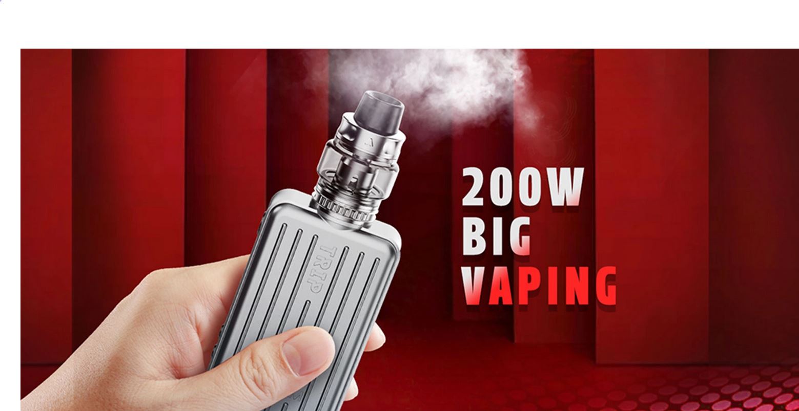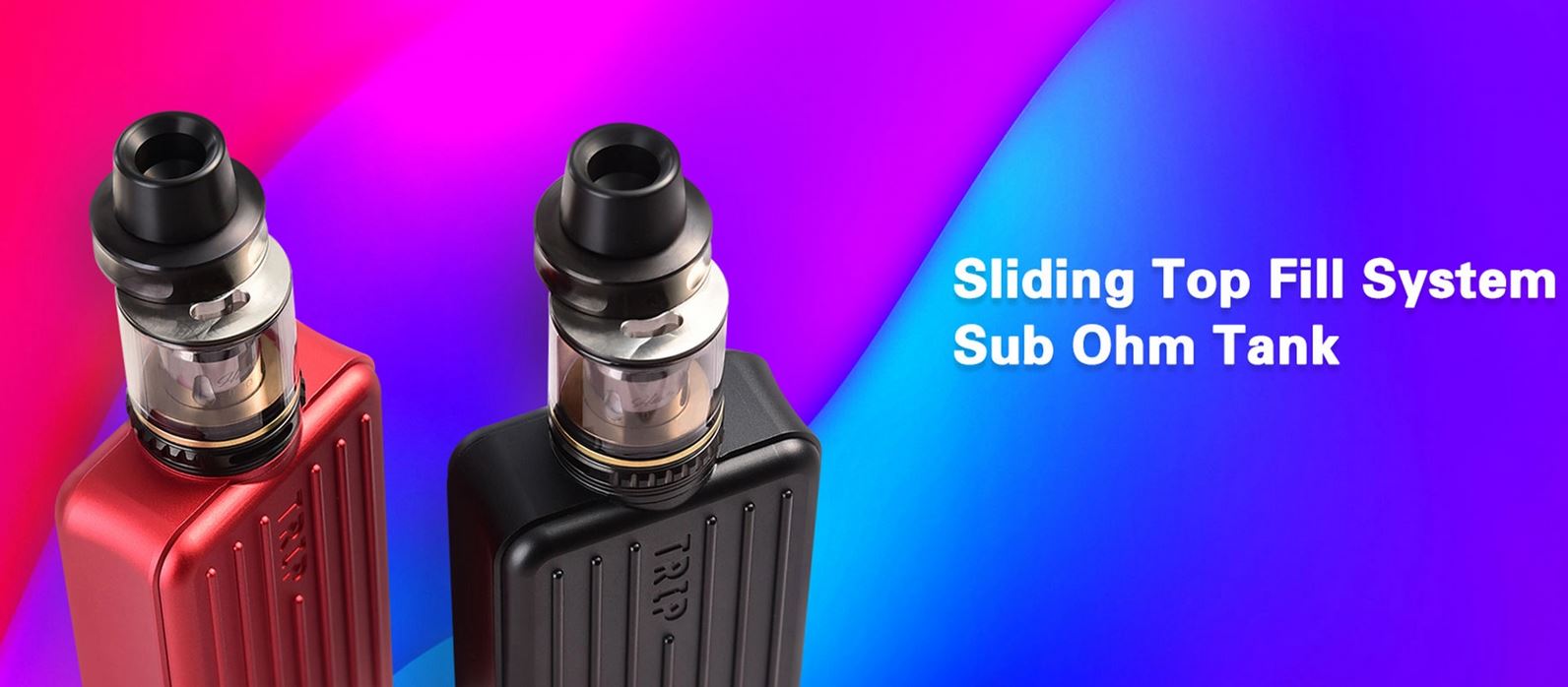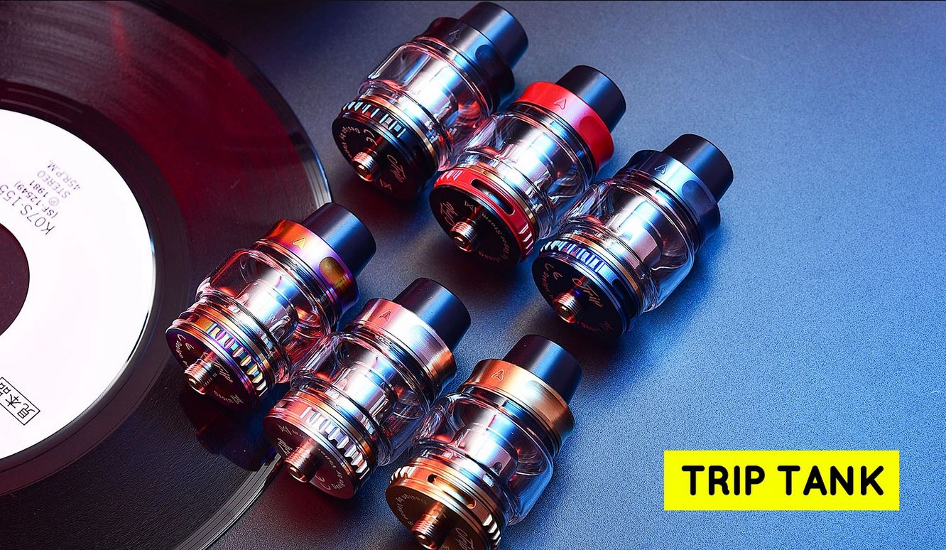 El Trip Tank es una versión mejorada de Hawk Tank, que presenta un diseño de tapa superior deslizante, y puede soportar los 200W del mod Trip. Cuenta con una capacidad estándar de 2ml.