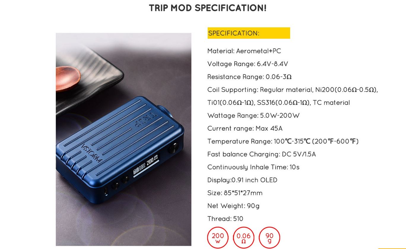 La inspiración del diseño del Kit trip de Vapor Storm proviene de una maleta de viaje, de ahí su nombre. Alimentado por baterías duales 18650, el kit Trip proporciona una potencia máxima de 200W (modo bypass), un poderoso firmware, y una gran pantalla de 0.91 pulgadas que ofrece una interfaz concisa y clara con dos barras de batería separadas. Su atomizador Trip Tank es de 2ml de capacidad y admite super sub ohmios a 0.06 ohmios. Para una mayor variedad de opciones, el mod cuenta con varios modos de potencia: (VWJ), TC ode (NI200, T101, SS316), TCR (M1, M2), modo de derivación y modo de curva (CCW).