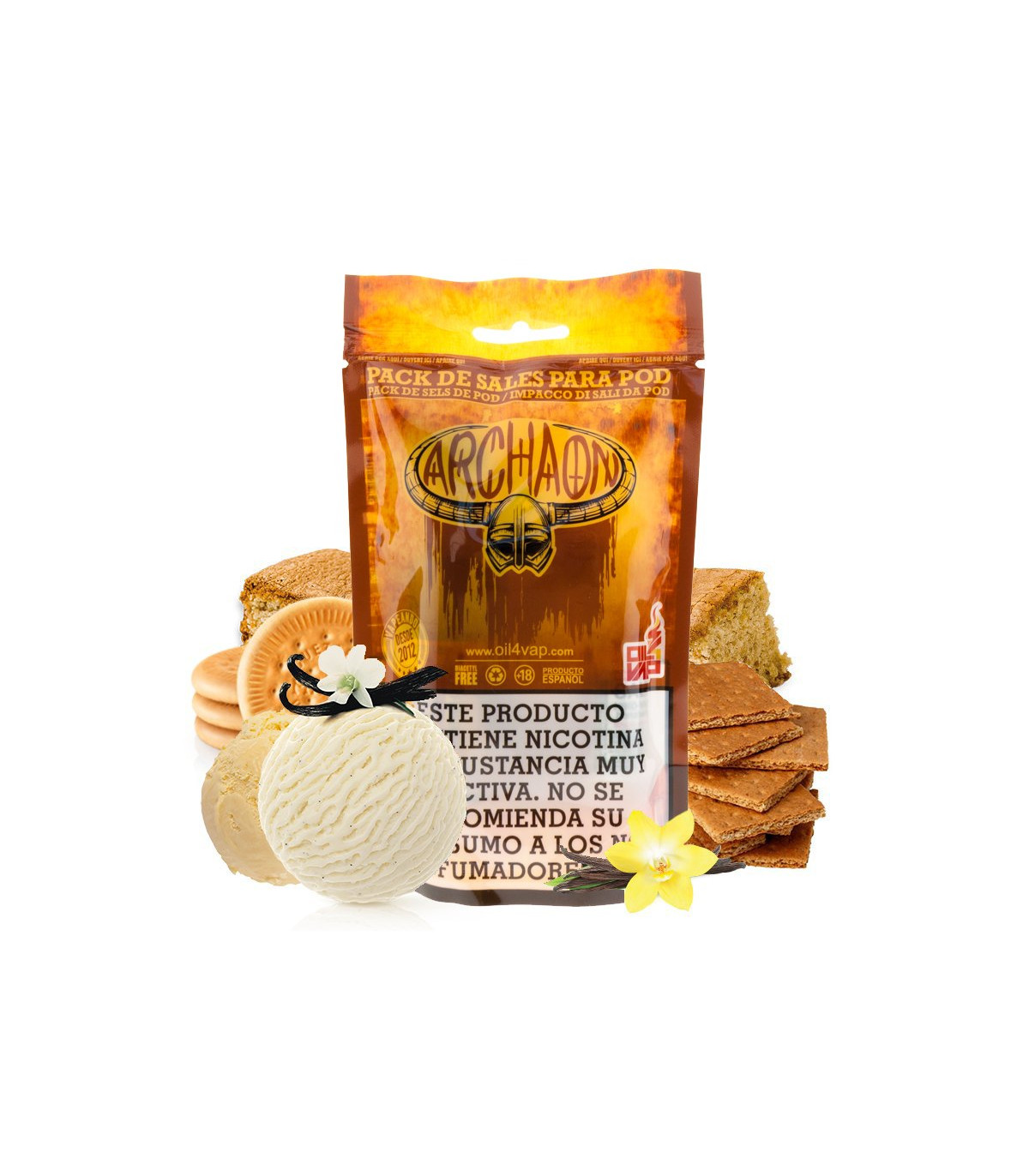 El Pack de Sales Archaon + NikoVaps de Oil4Vap sabe a bizcocho de vainilla, toques de galleta graham cracker, huevo, galleta maría, helado de vainilla y ¡un ingrediente secreto!