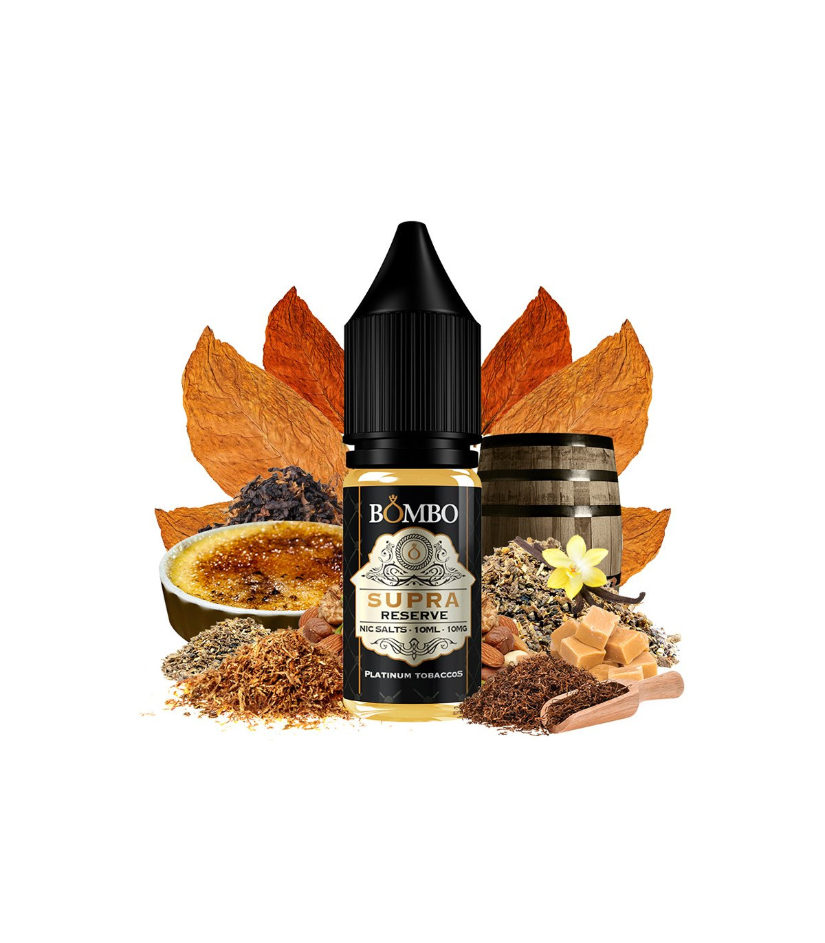 El líquido Supra Reserve de Platinum Tobaccos Nic Salts by Bombo es la unión del mejor tabaco dulce con equilibrados matices acaramelados y tostados que, junto a una innovadora técnica de doble maceración, lo sitúa en el siguiente nivel dentro de los RY4.